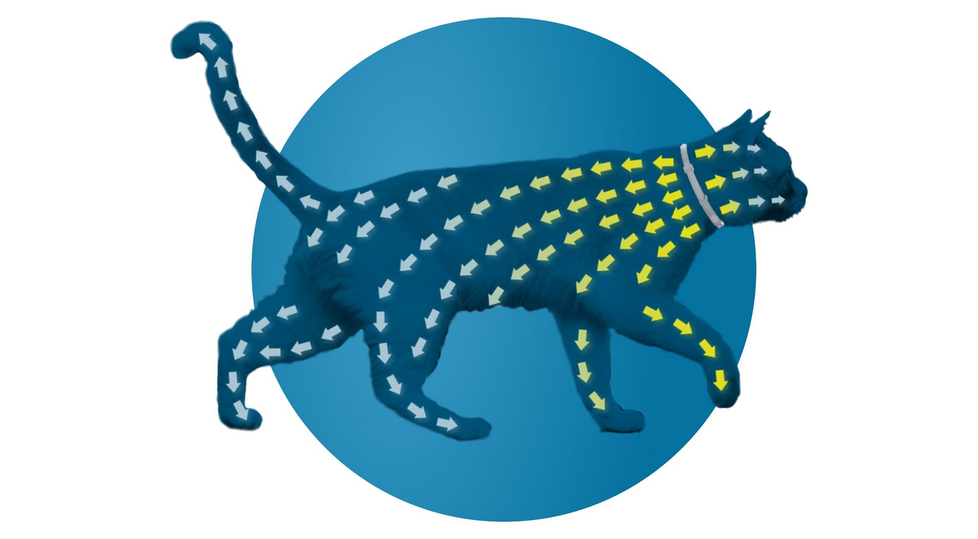 The continuous distribution technology ensures that both active ingredients are slowly and continuously released from the collar toward the animal. This ensures that concentrations of both active ingredients are present on the dog during the entire protection period. The active ingredients spread from the site of direct contact over the skin surface.